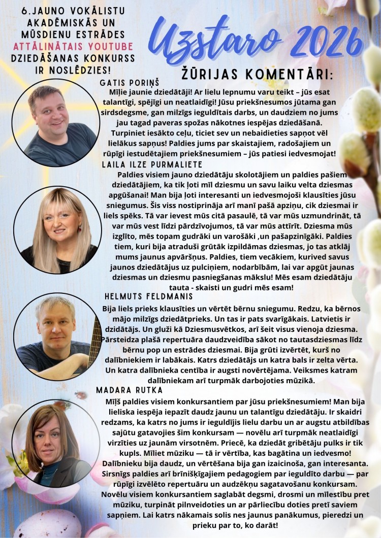 Madara Rutka- Priecājos par visiem jaunajiem dziedātājiem, Jūs esat “Lieliski”, katrs viens! Mūzika, tā attīsta un pilnveido mūs, jebkurā vecumā, un klausīties tik skaistus, un emocionāli piepildītus priekšnesumus, tas man bija brīnišķīgs ceļojums mūzikā. Konkursa dalībnieki ir ļoti atbildīgi un nopietni gatavojušies, tas ir redzams viņu priekšnesumos. Pateicoties pedagogiem, ir paveikts brīnišķīgs un liels kopdarbs, vēlu arī turpmāk, daudz radošu ideju.